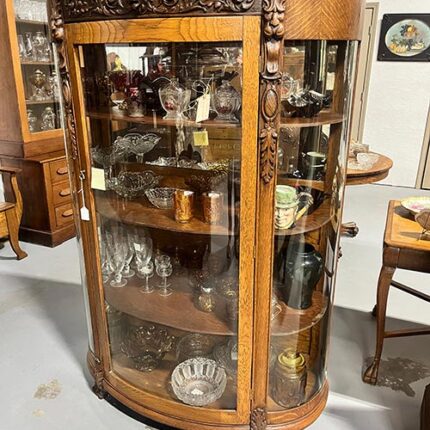 Antique Carved Oak Bow-Front Curio